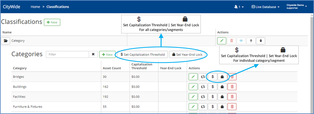 1. To set for all categories/segments, click Set Capitalization Threshold or Set Year-End Lock in the upper right corner. Enter a value/year in the popup and click the Set button.