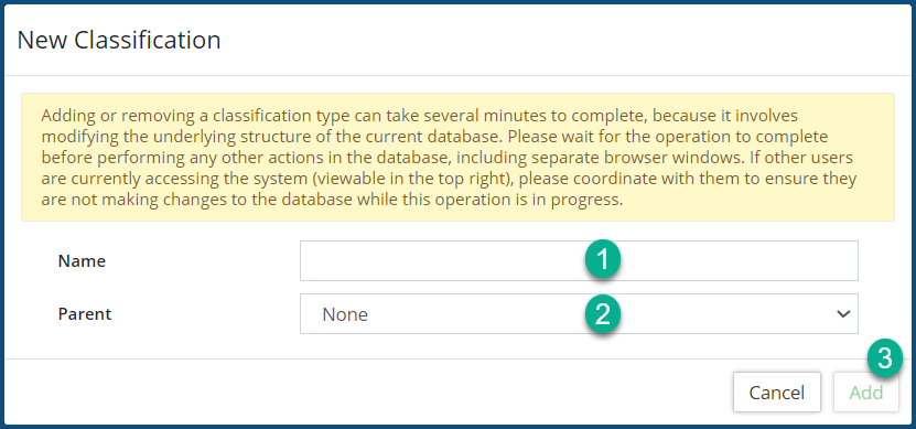 Also, note that both the addition of new classifications and the deletion of existing ones may involve significant amount of time during which no other operations on the database should take place. The duration depends on the size of your existing database. See the messages in each of the dialog boxes—New and Delete—for more information.