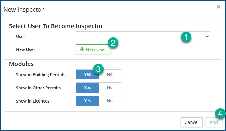 - Select a user from the User ❶ pull-down. If the prospective inspector has not been setup yet as a User and if you have Admin privileges, you can set up a new user account on the fly by clicking on + New User ❷. (Click here from instructions on adding a new user.)