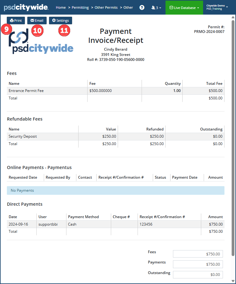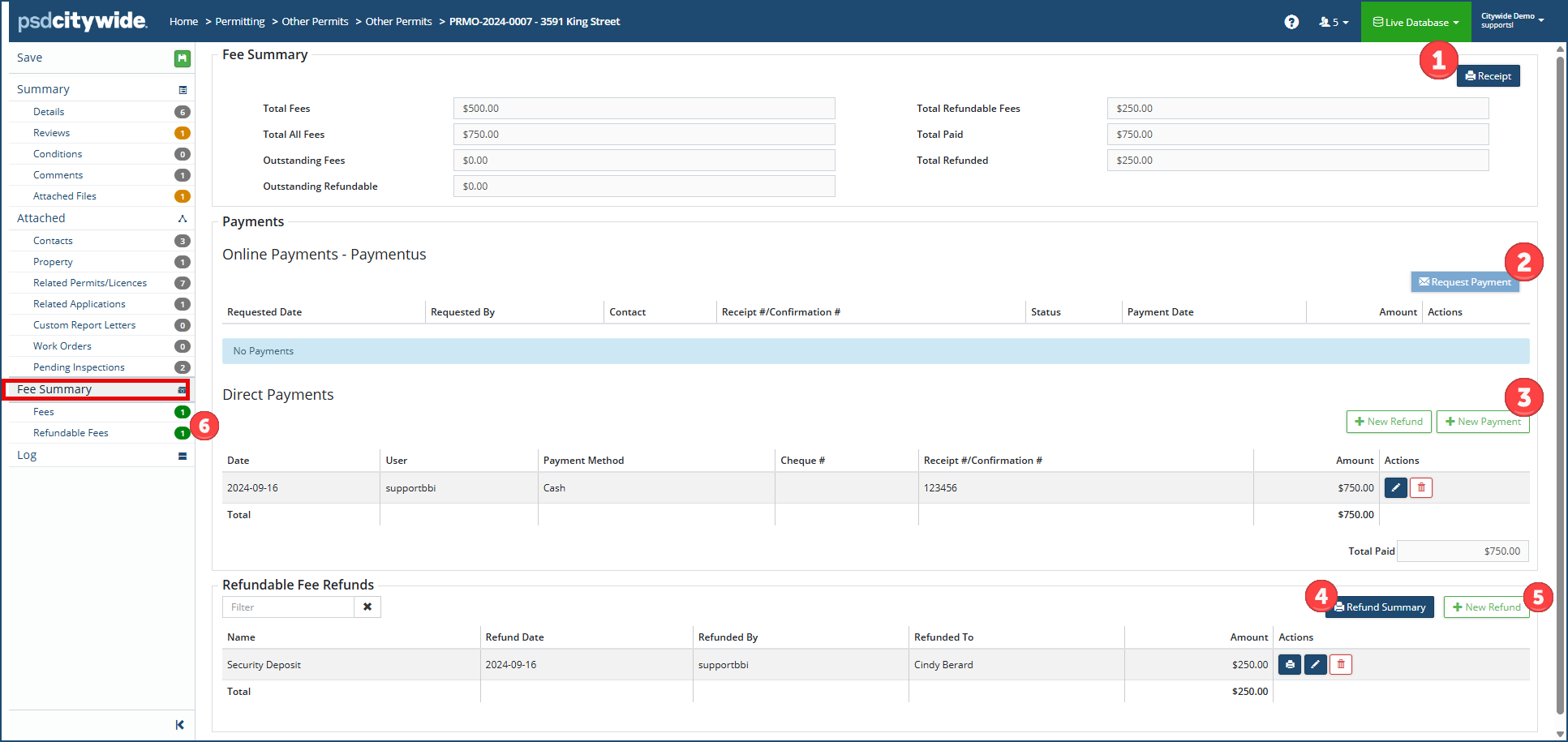 The Fee Summary screen summarizes all fees, charges, payments and refunds associated with the current permit, and it provides you with the ability to issue receipts , process online  and direct payments , and view ❹ and issue refunds . All of fees, charges, and refunds are entered in the respective sections  below Fee Summary.