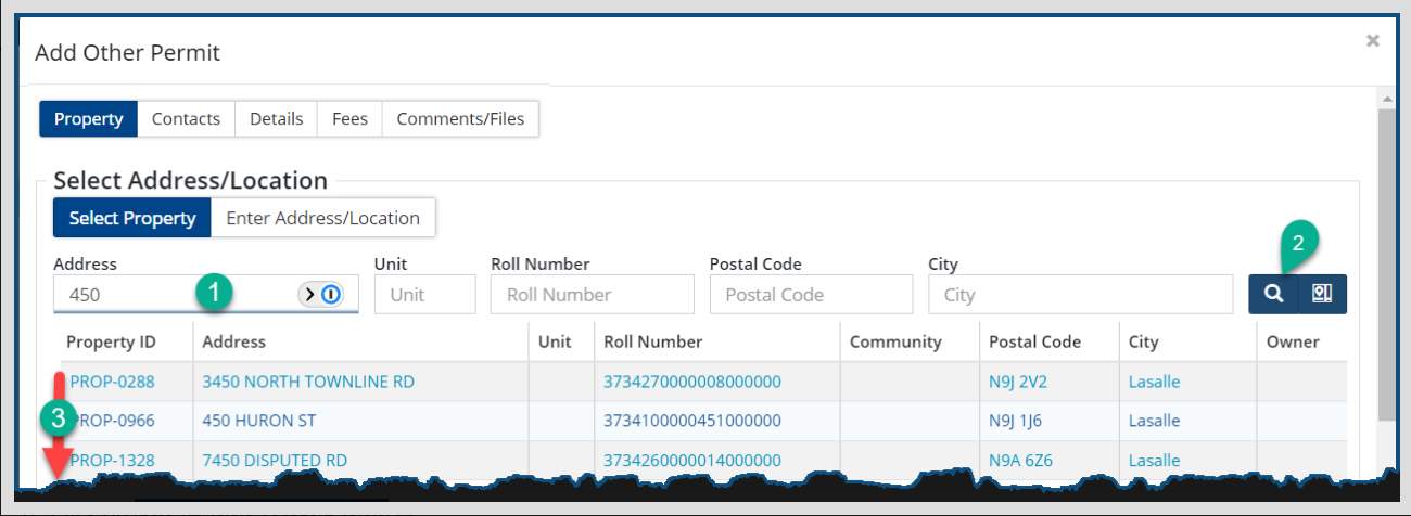 1. Enter full or partial information in any one of the fields on the screen and Click the Search icon  to product a list  from which you can select the property:
