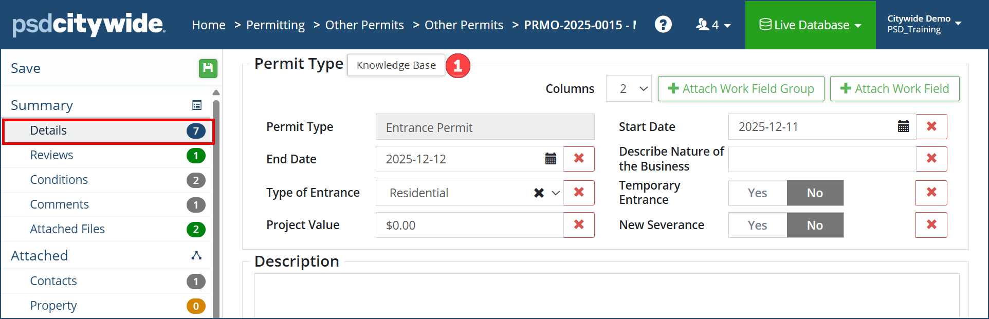The screen is organized around a set of field groups 🅰. each group containing a set of related fields. You can click  + Attach Work Field   within a group to add a new field. Fields, such as "Describe Nature of the Business" and "Business Licence number" can be removed by clicking the  X   next to them, if, for example, this permit does not apply to a commercial property. field to remove it. Click  + Attach Work Field Group   to add a new group to the screen, where you can then add fields to it.