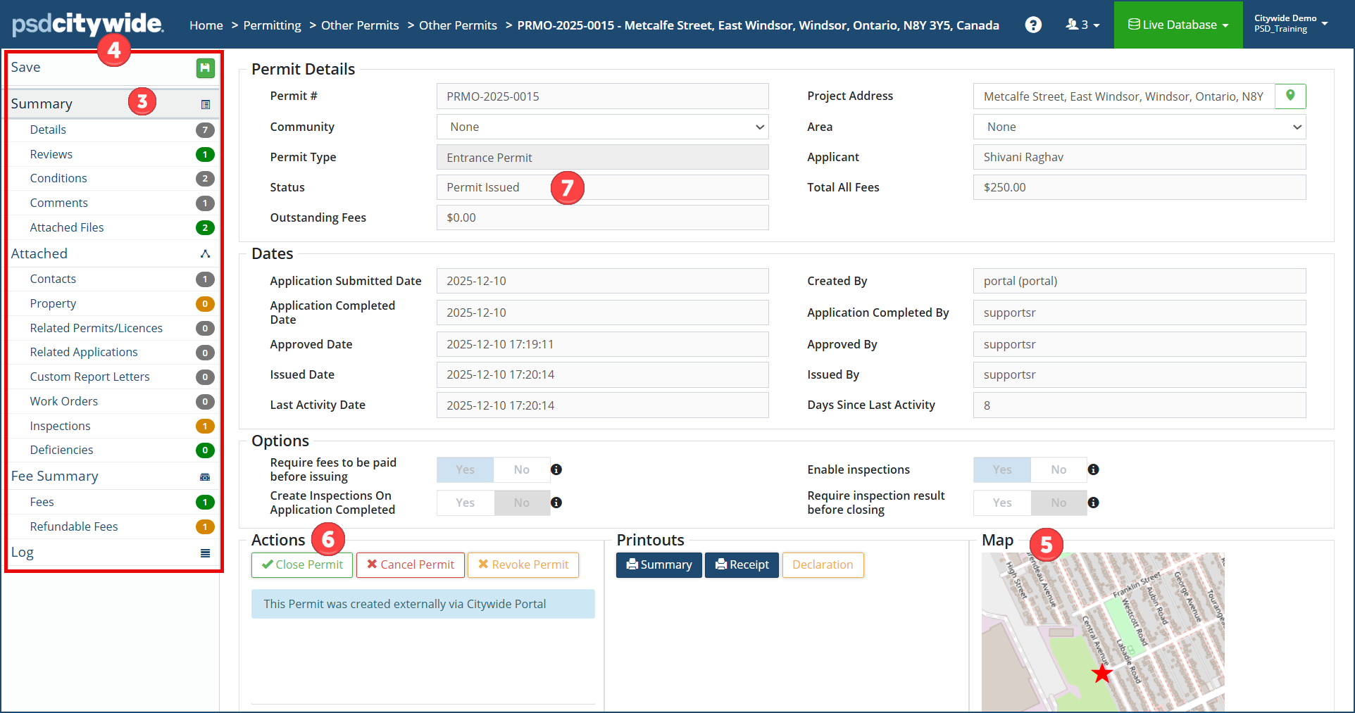 All the fees (charged and refunded) associated with the Permit appear on this screen. At least one of the fees that appear on this screen is linked to the Permit Type— in this example, the "Entrance Permit Fee" ❶ fee that is fixed fee  of $500.00 . Other may be calculated. (See Fees for details.)