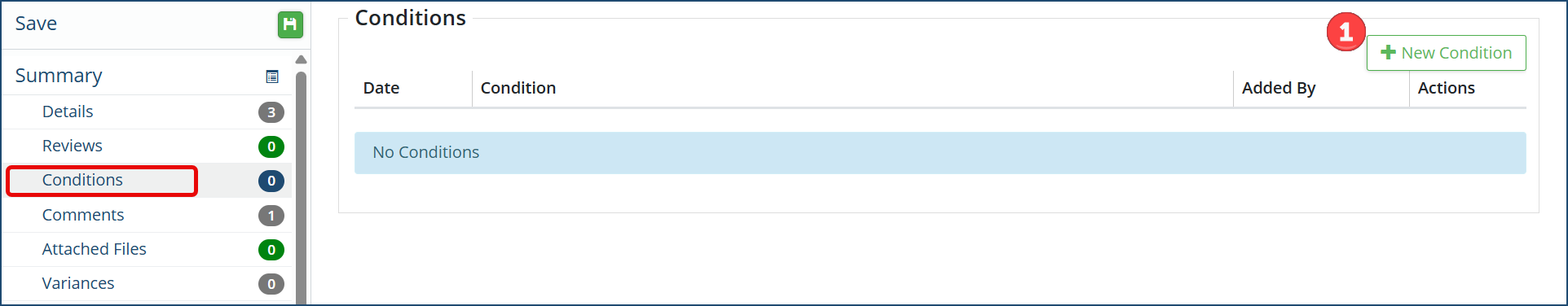 2. Conditional Pass: indicated qualified or conditional approval, subject to correction of the Deficiencies added after clicking + New Deficiency  .