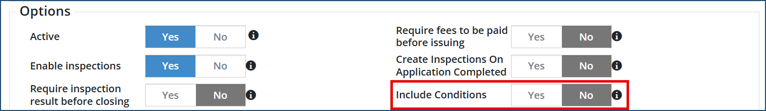 - In the licence type Details, view the Options Group section and toggle the 'Include Conditions' to Yes. This will enable Conditions on the left side affiliate panel.