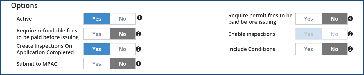 There are instances in which particular types of fees may be refunded in connection with an individual permit type. This is the place where you set up the applicable types of refunds that have been created and defined in Refundable Fees.