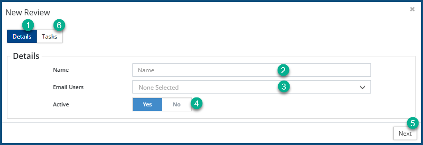1. Click on  +Add Review  . The New Review dialog box appears, with the Details  tabs pre-selected: