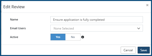 4. Ensure the Active flag is set to Yes. If set to No, the Review will not be available in the system. “No” might be the setting for a new Review to be used some time in the future, or it could be the setting for an existing Review that is no longer used (but not deleted, so that data pertaining to it is retained in the system).