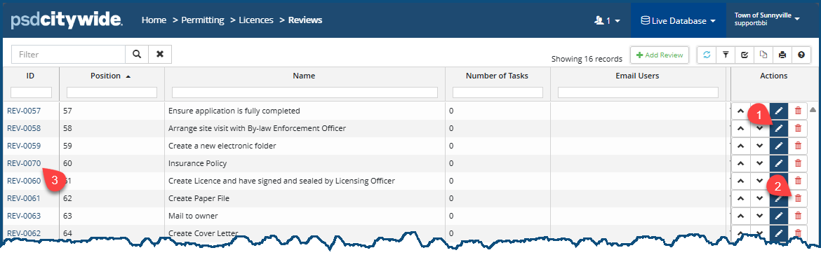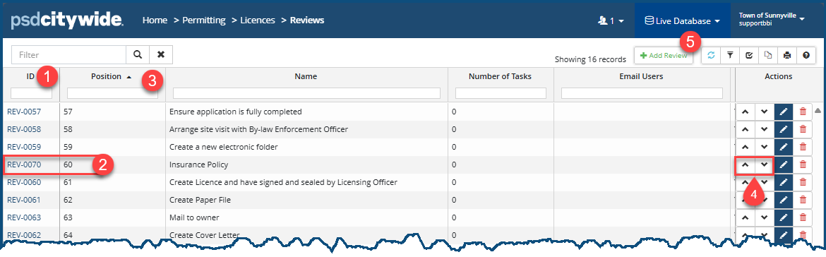 The ID column contains the numbered Review, each of which is a link to the detailed Review record. The numbers for each of these records are automatically assigned sequentially by the system when the Review record is being added. The "Insurance Policy" record appears to be the 60rd created Review record (based on its ID), but it occupies the fourth position in the Position column . It has been moved to its current position using the up/down arrows . All Review records can be positioned in this manner, placing the most commonly used Reviews nearer to the top of the list.