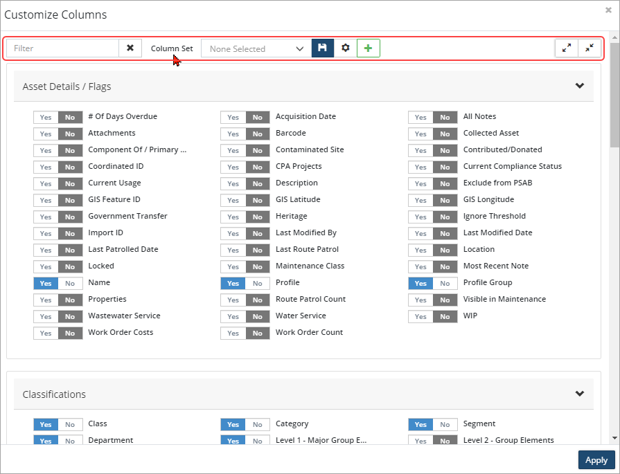 3. Navigate through the sections and click yes/no to display/hide the column in the view.  Click Expand All/Collapse All,  ,  in the top right to display/hide the options within the sections.