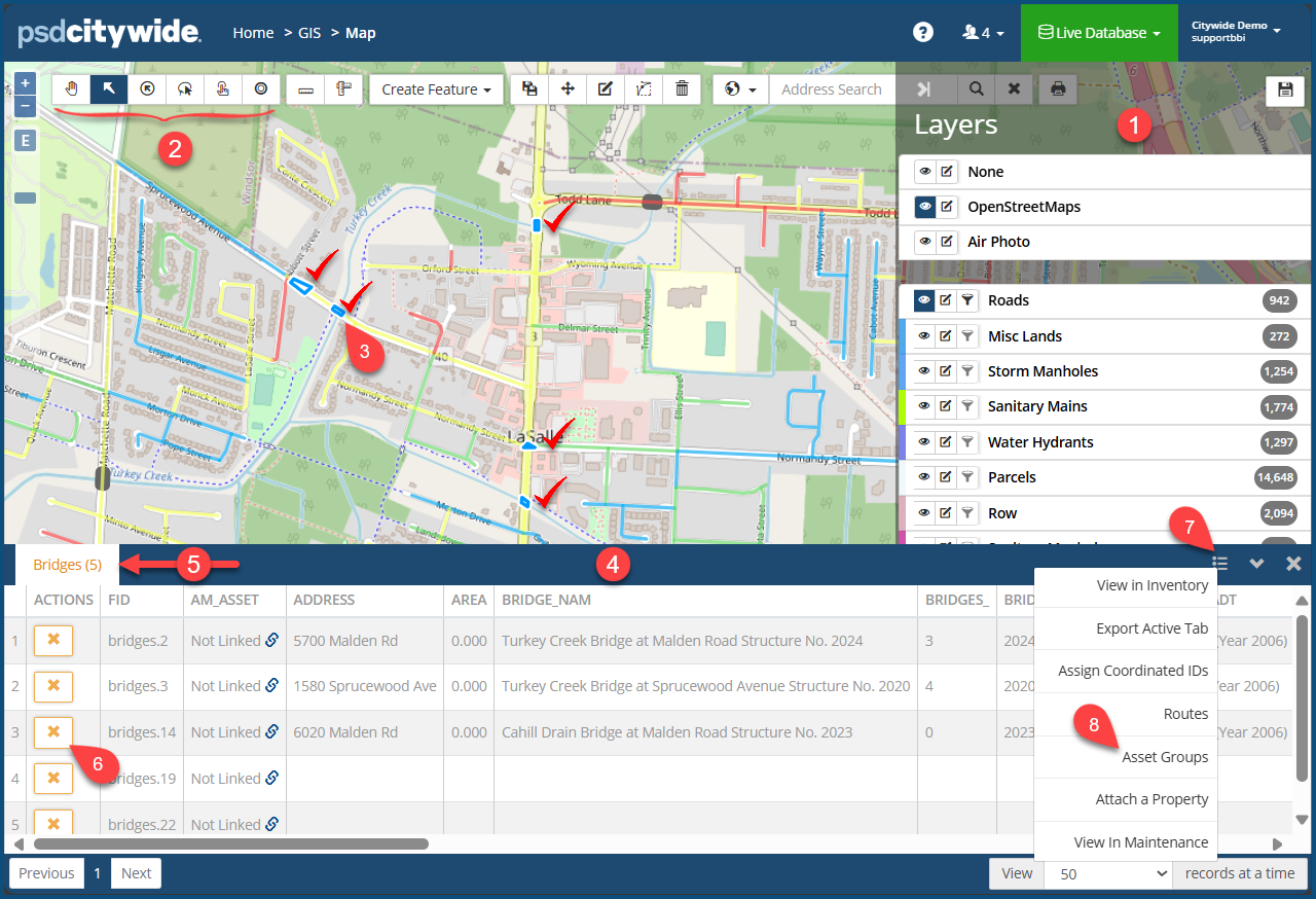 ) were selected on this map.) They are highlighted in the GIS Viewer in blue ❸ and produce a table ❹ consisting of the assets. Dissimilar assets will appear in separate tabs ❺ according to their asset type. (In this case, only bridges were selected for the current asset group, resulting in a single tab.) - Click on the