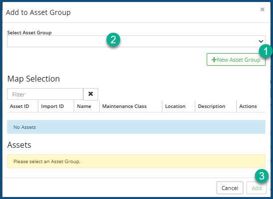 - Click Select Asset Group ❷ to add the selected assets to an existing group.