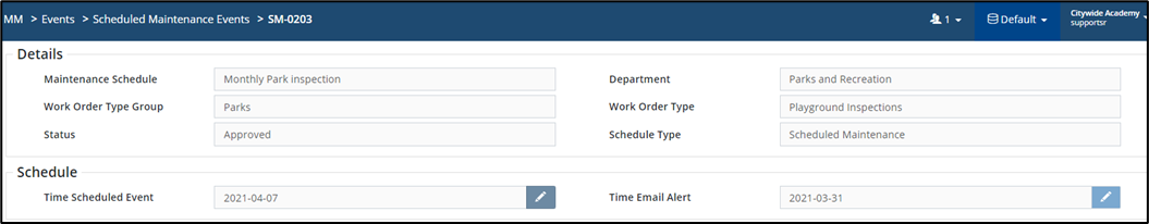 - Scheduled Maintenance (SM) has Auto-Approval turned on 🅱 by default, resulting in work orders being created as soon as an SM Scheduled Event is triggered.