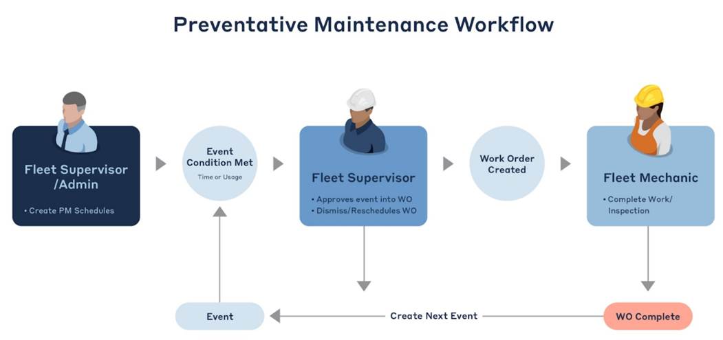 The graphic below provides an example of Preventative Maintenance Process for a Fleet Workflow: