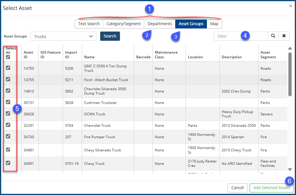 - Select the assets by applying one or more filters using the criteria accessible from the tabs ❶. If you apply more than one filter, the resultant list of assets will be the product of all the all the applied filters (compound filtering). In the following example, two filtering criteria were used: Departments = Roads ❷ .AND. Asset Groups = Trucks ❸.