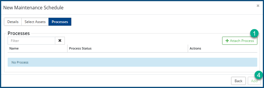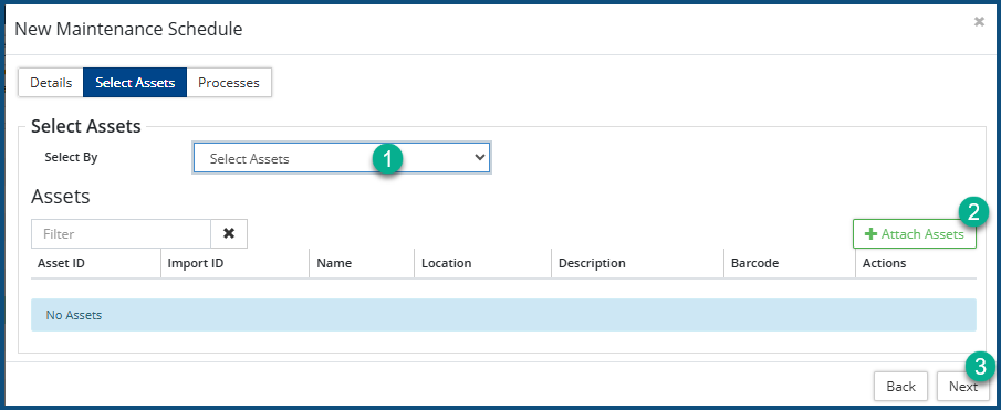 - Click on + Attach Assets ❷. The Select Asset dialog box appears: