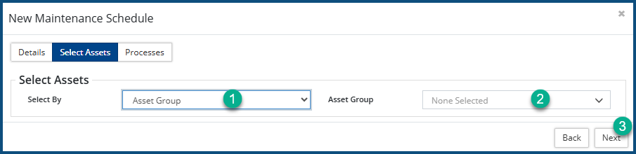 - If you selected Select Assets from the pull-down, the New Maintenance Schedule dialog box expands: