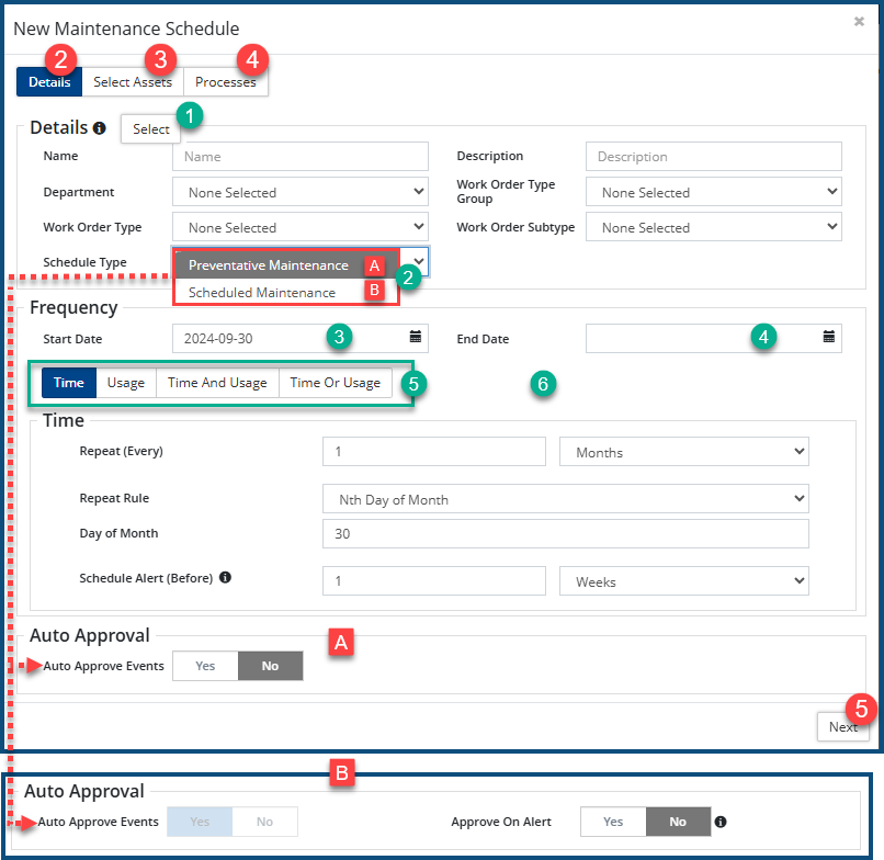 The New Maintenance Schedule dialog box appears, defaulted on the Details tab ❷. - Click Select ❶ to select a Department, Work Order Type Group, and Work Order type, or.
