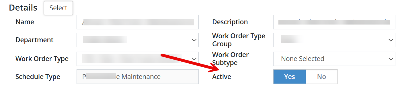 - Enter a Name and Description for the new schedule. Select a Department, Work Order Type, Subtype, and Group as needed.