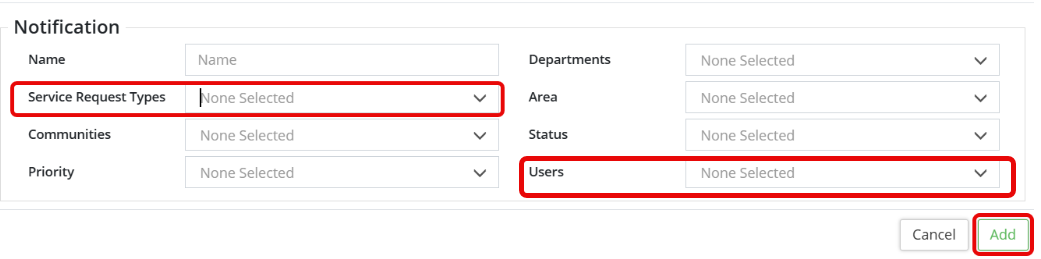 - To add a new service request notification, scroll down and click +Add Service Request Notification and complete all the Service Request Notification fields. Add the service request type to the existing selection in the Service Request Types field (be sure to Ctrl+click). Users drop down indicates the user(s) that will be notified. The Asset Primary Contact is also a User selection available when setting up Service Request and Work Order Notifications.
