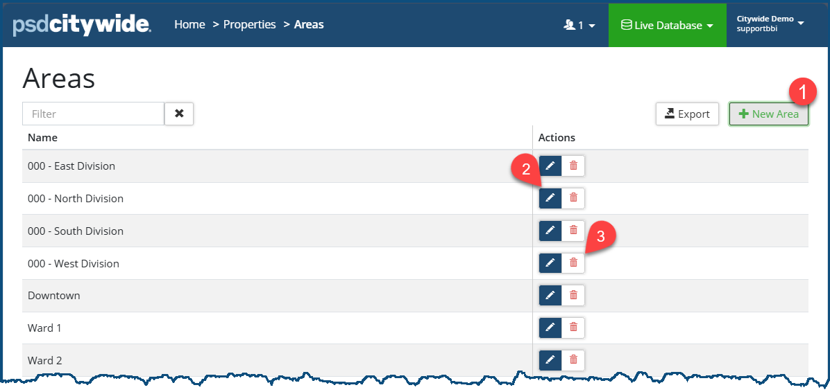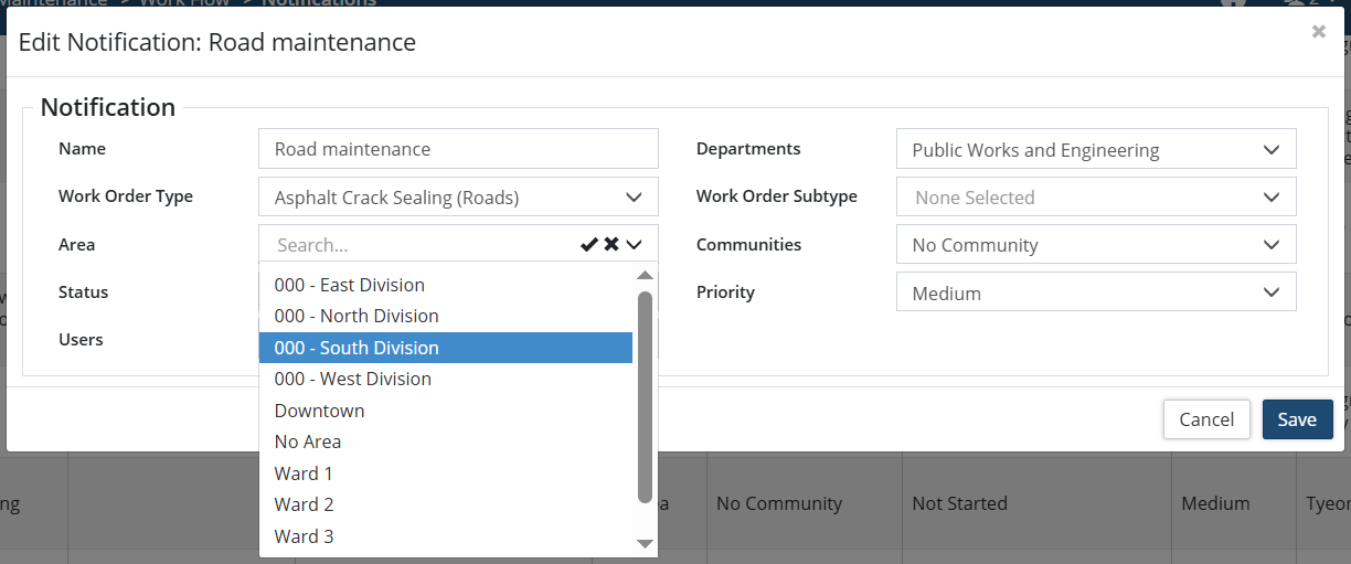 Areas information is used in the system as a means of grouping and classifying service requests and work orders on the basis of local wards or zones. Reports and on-screen views can then be generated broken down by or filtered by, among other factors, area. Notifications can be sent to area-specific supervisors.