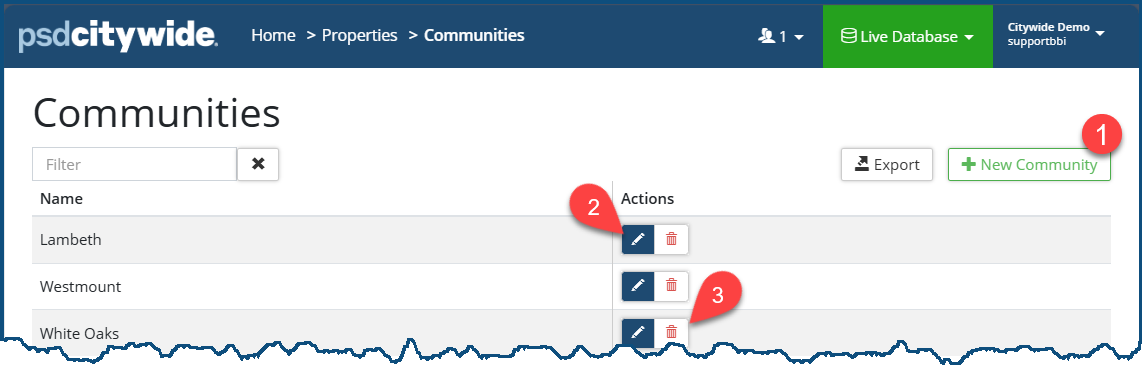 Communities information is used in the system as a means of grouping and classifying service requests and work orders on the basis of local neighborhoods or hamlets. Reports and on-screen views can then be generated broken down by or filtered by, among other factors, community. Notifications can be sent to community-specific supervisors.
