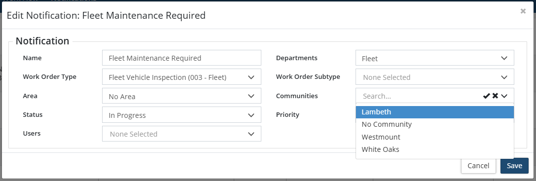 If Community is enabled for a database, it appears as an additional field in service requests and work orders. Maintenance reports can be generated on the basis of Communities (primary or secondary grouping factor). Notification rules can be set up for specific service request types and work order types by communities. See a Notification example below.
