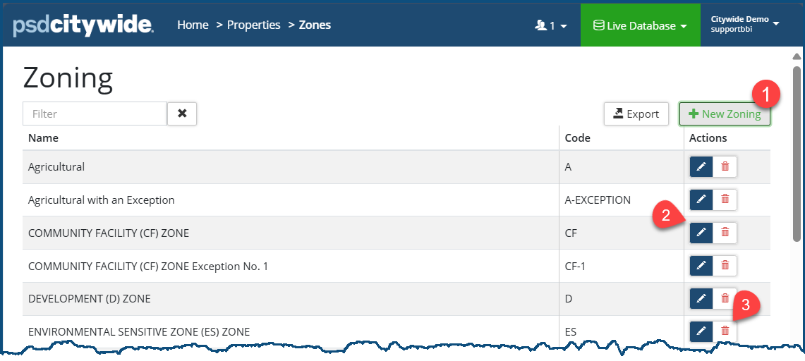 To edit a Zoning and/or the Zoning Code, click the Edit icon