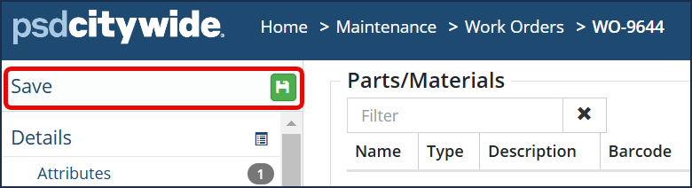 Users with the appropriate permissions can link a work order to Parts and Material which then allows costs and inventory to be tracked.  All linked parts and material can be viewed on the Parts/Materials screen.