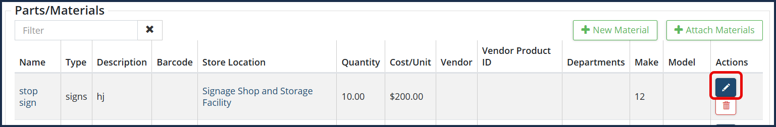 When viewing Parts/Materials assigned to Work Orders, you can view and edit the quantity of units assigned: