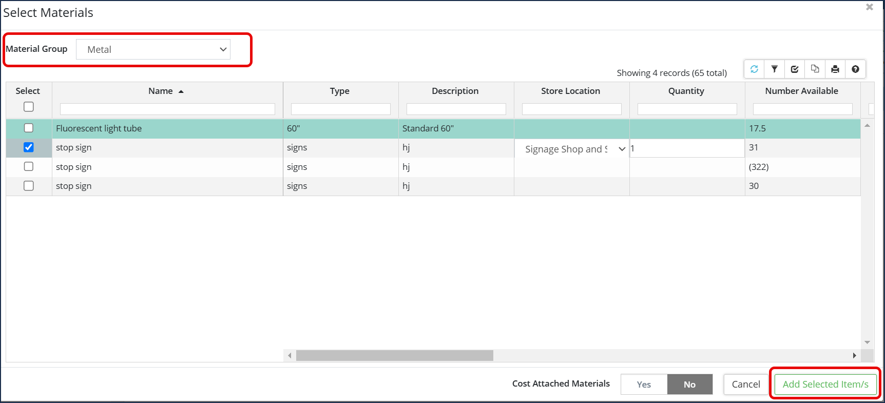 1. Click the +Attach Materials.  Use the Material Groups drop-down to filter the list if needed.