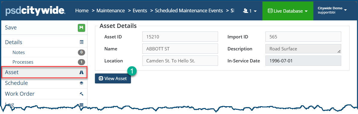 Click on View Asset ❶ to see locate the record for the asset in the Assets Module (Assets Inventory) where comprehensive information concerning all aspects of the asset can be seen.