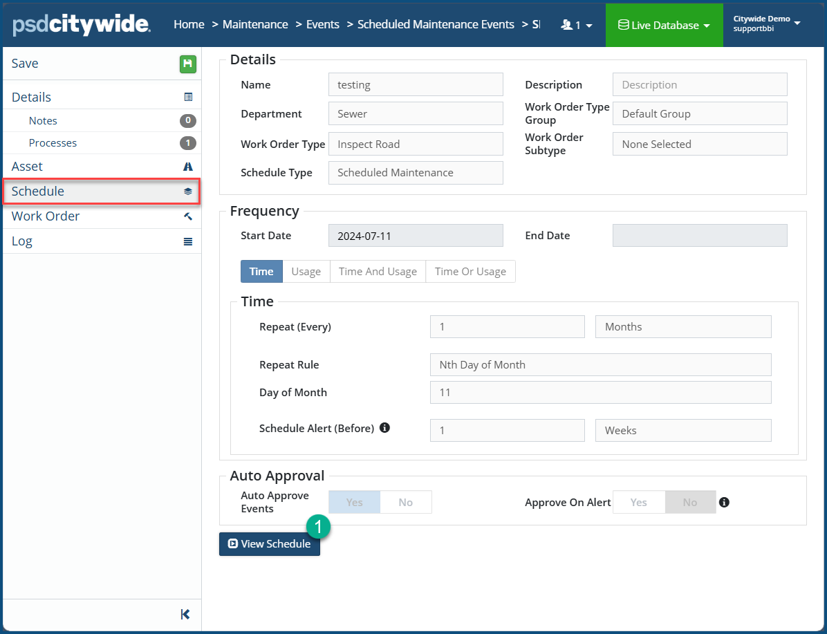 The Schedule option displays the current settings for the Event—those that have been set up in Maintenance Schedules. They appear in a read-only informational state.