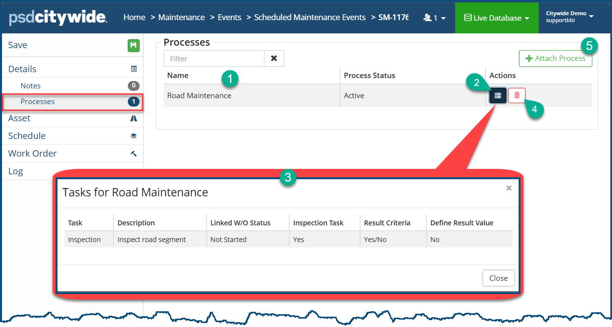 ❷ associated with the process. The Tasks for {Process Name} ❸ dialog box appears. - The information in this list is informational. If tasks are missing or need to be deleted, this must be done in Home 🢡 Maintenance 🢡 Processes 🢡 Manager 🢡 Work Flow: Processes