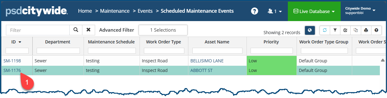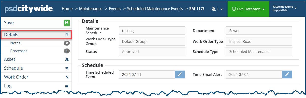 - Click on the SM ID ❶ number for the event. The event record appears, defaulted on the Details screen: