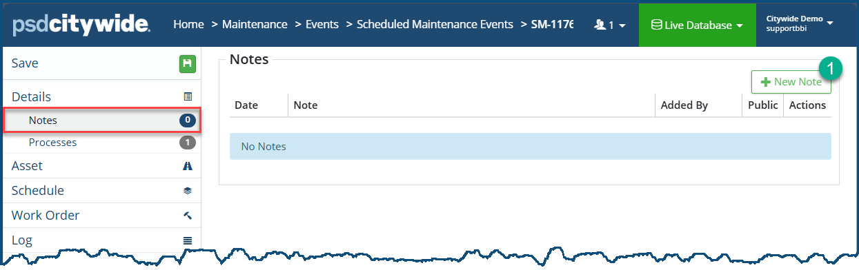 - Click on +New Note ❶. The Add Note dialog box appears: