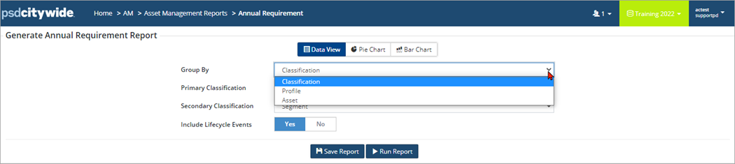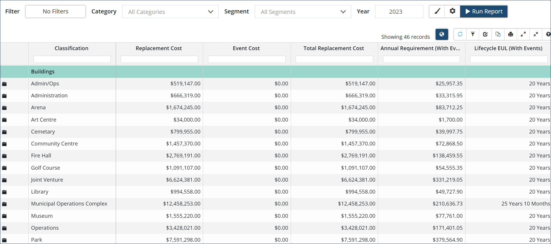 The Annual Requirement report provides a summary of the average yearly investment amount needed to maintain infrastructure, and includes Lifecycle Events by default. A cumulative total is included at the bottom of the report. Data can be grouped by Classification, Profile, or Assets.