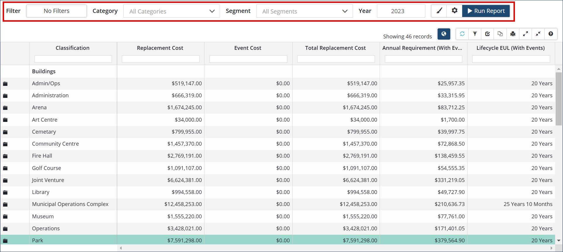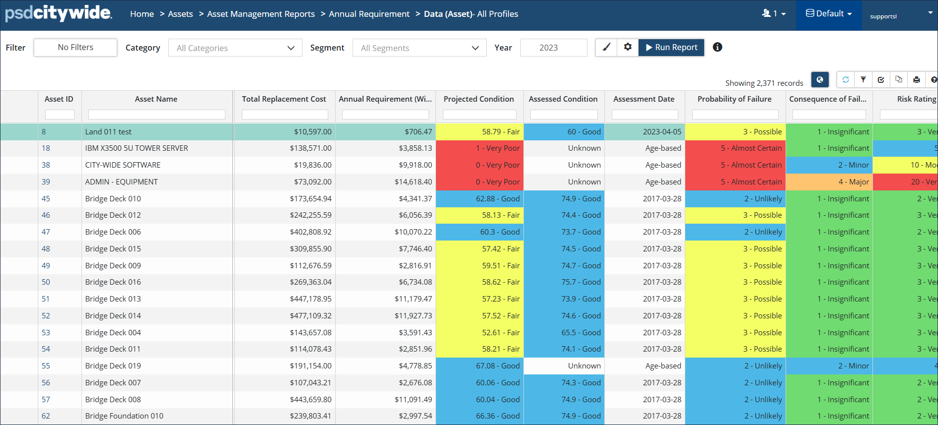 Comprehensive report showing the annual requirements, along with condition, risk, and lifecycle information for each individual asset. Rather than grouping the data by Classification or by Profile, this report shows each asset individually without any aggregated totals. This report is best for exporting into Excel if additional calculations, sorting, or filtering outside of Citywide is needed.