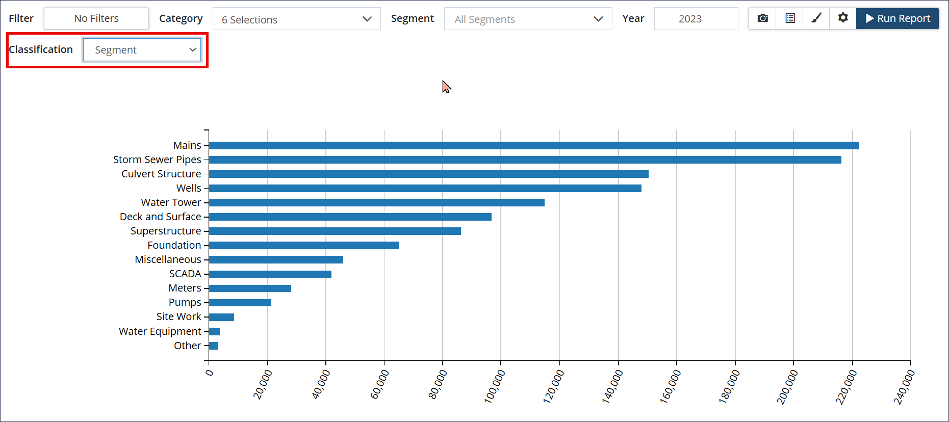 Bar Chart: Visualization of the Annual Requirements in a horizontal bar graph. Hover over an individual data point to display a screen tip with a total annual requirement $ amount. Click to show/hide Total, Sort the x/y-axis in ascending/descending order, change Font Size or # of Decimal Places. Click Modify Report settings to Include Lifecycle Events, use Adjusted Event Costs or filter the data to include only Capital, Operating, or Growth events.