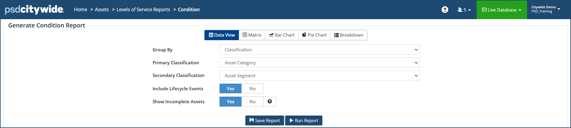 Data View: Classic report view showing the projected condition of assets, last condition assessment value and date, cost (replacement or historical, depending on settings), etc., for a reporting year. As well as Classification or Profile totals. Selection criteria settings include: ● Group By ● Primary Classification ● Secondary Classification ● Include Lifecycle Events ● Show Incomplete Assets