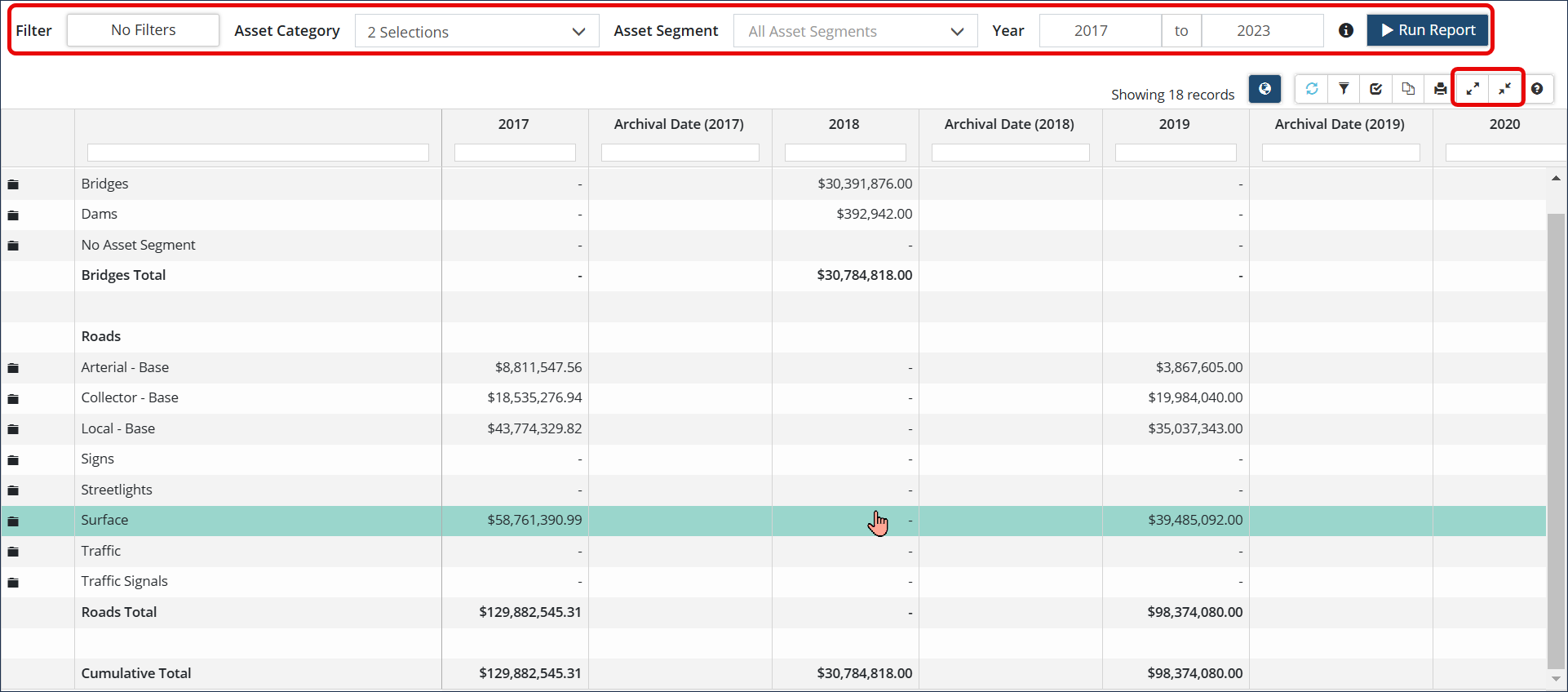 icons in the top right corner of the grid to view detailed data within the asset segment folders.
