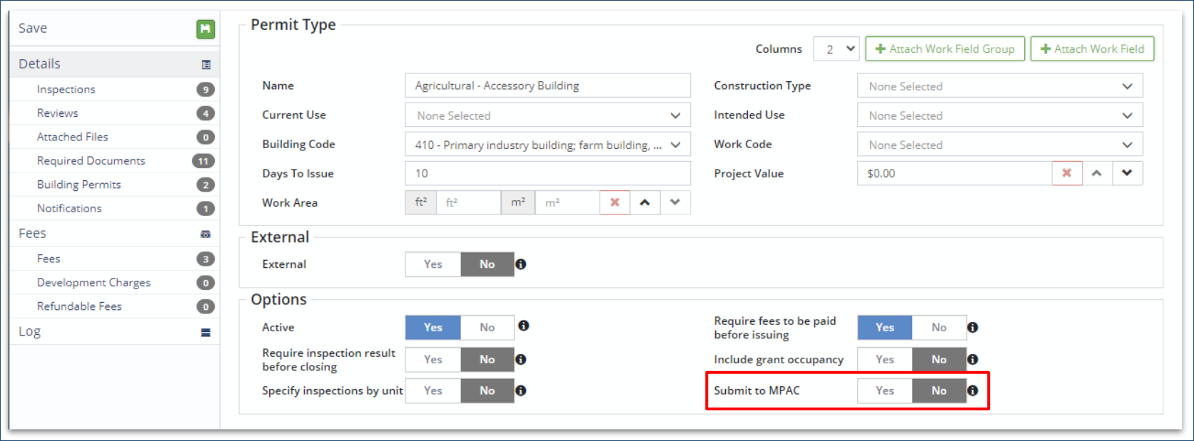 Once the integration has been set up in the database, you can enable the permit data details and required documents for submission to MPAC with the steps below.