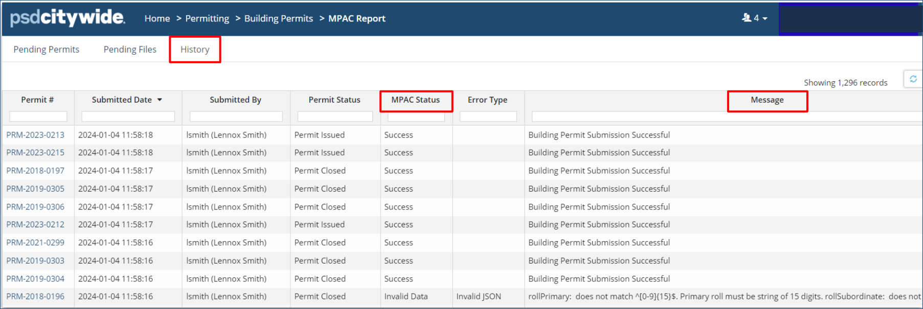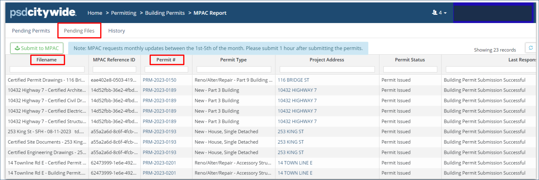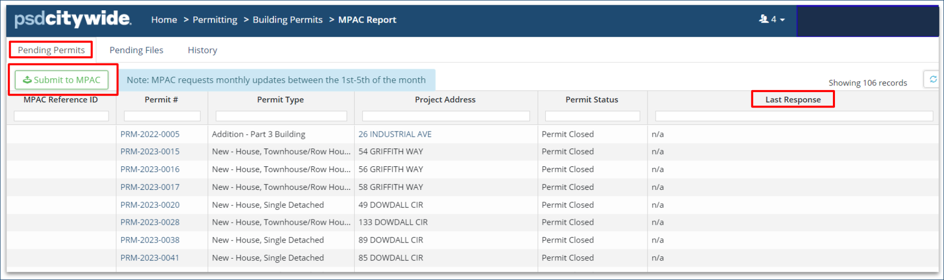 • Permits that have changed status within Citywide (issued, closed, cancelled or granted occupancy) will display in pending permits, and will be submitted when Submit to MPAC is clicked. After successful submission, they will be removed from the ‘Pending Permits’ tab.