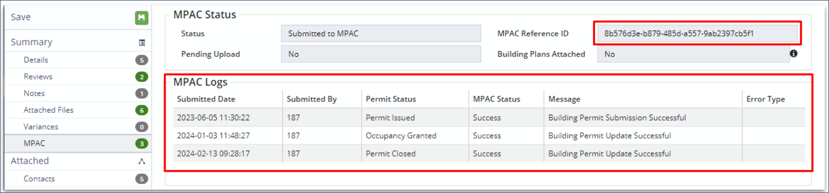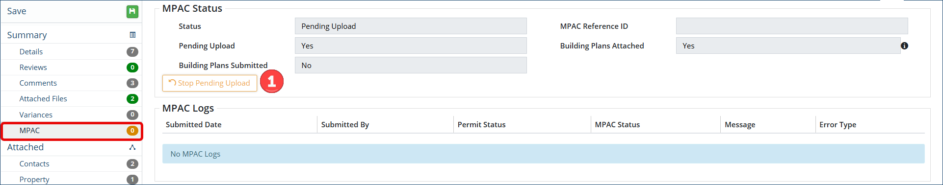 • 'Stop Pending Upload button can be used to stop the permit details from being submitted to MPAC via the integration.