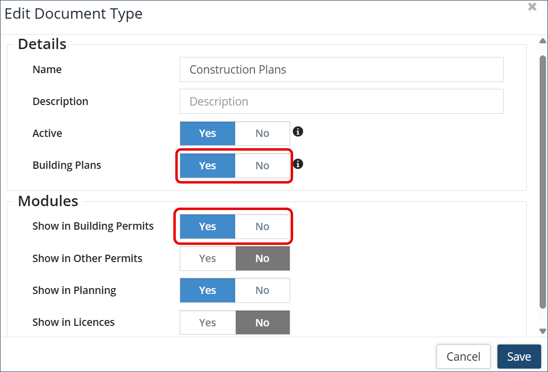 3. In the Details page, set the document type to be sent to MPAC to ‘Show in Building Permits’ and ‘Building Plans’ toggle to Yes