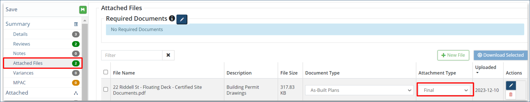 3. Once the files are transmitted to MPAC, the Attachment Type in the permit is set to 'Final' for each document.