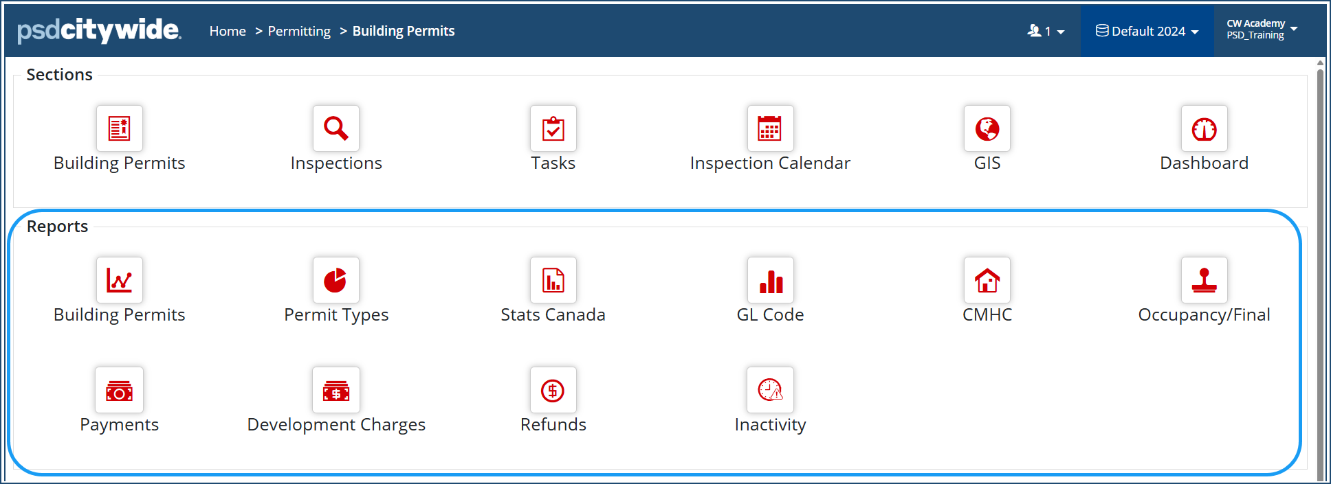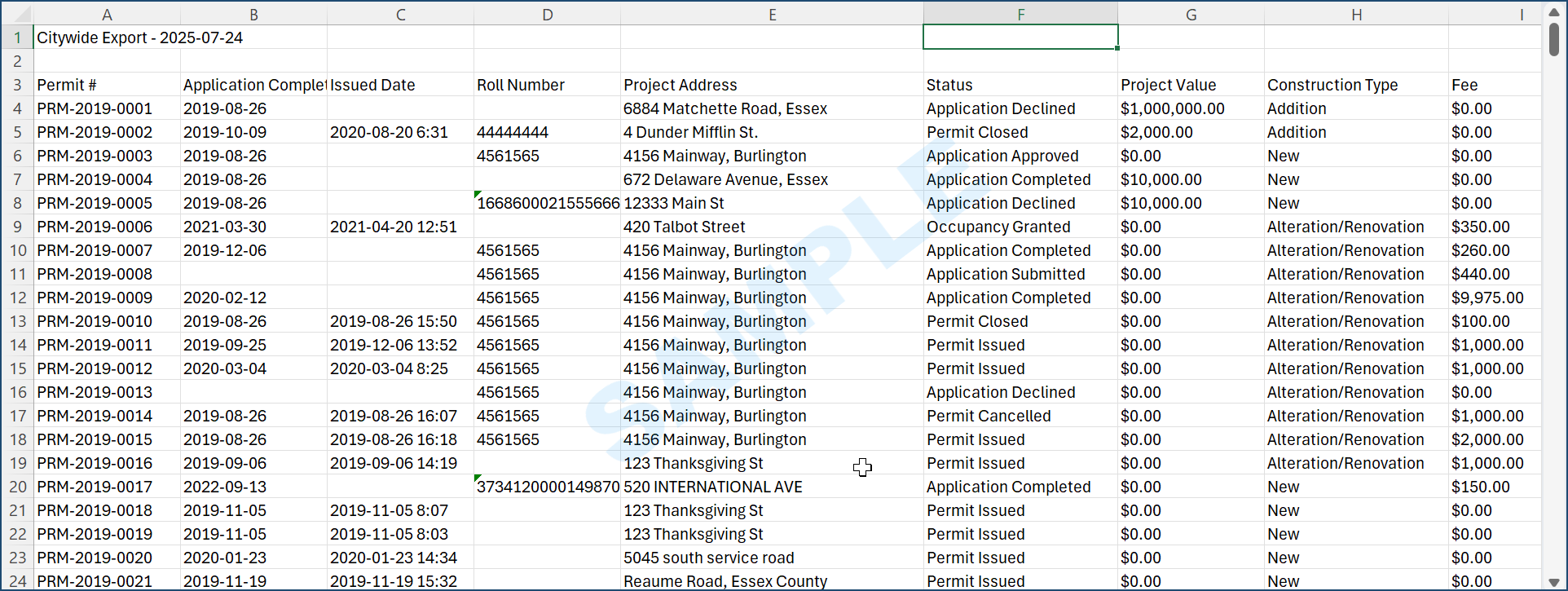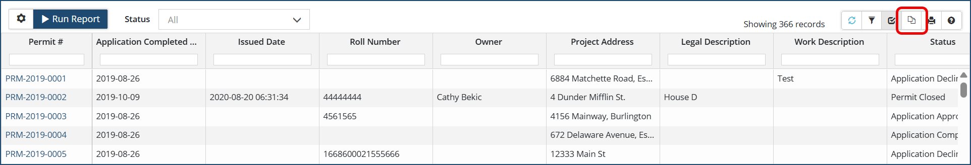 Stats Canada (applies to Building Permits only) This report shows all building permit applications with their detailed information required for submission to Stats Canada.