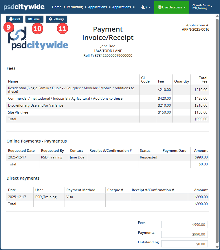 The Fee Summary screen summarizes all fees, payments and refunds associated with the current application and it provides you with the ability to issue receipts ❶, process online ❷ and direct payments ❸, and view ❹ and issue refunds. All of fees and refunds are entered in the respective sections below Fee Summary.