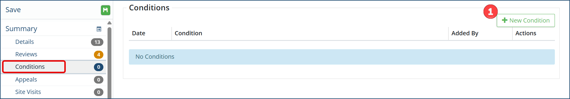 ❹ indicates that the property linked to the application has a GIS mapping. No icon indicates that that the application was created manually in the system and that it does not have a GIS mapping. Clicking on the GIS globe icon