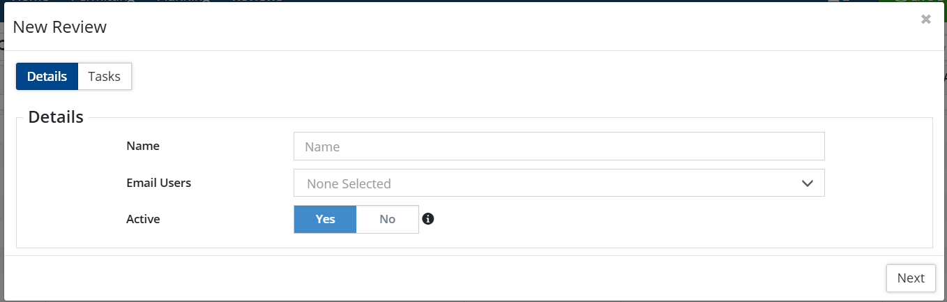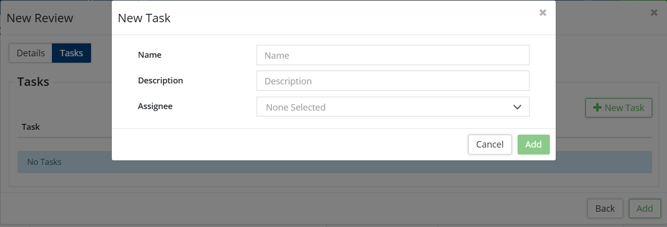 - Click on +Add Review . The New Review dialog box appears, with the Details tabs pre-selected: